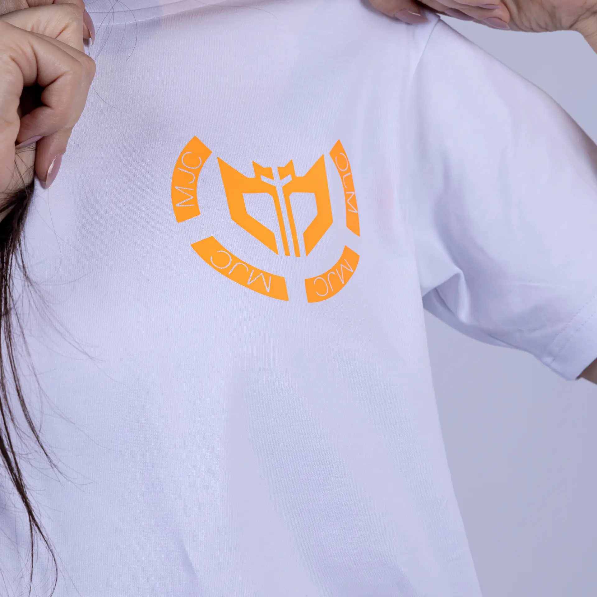 أبيض أنيق مع شعار MJC بلون أصفر مشرق على الصدر. -