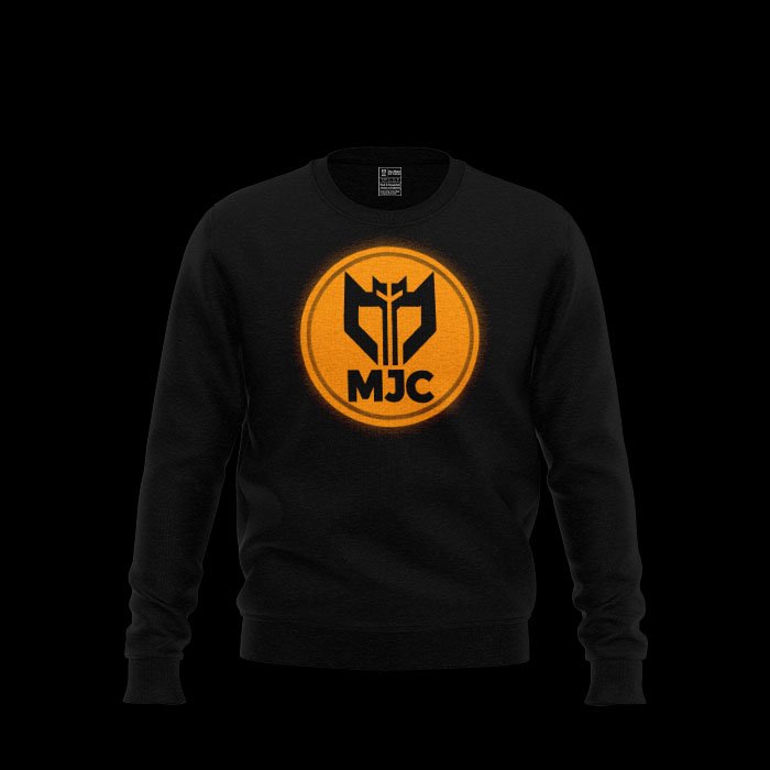 - تفاصيل التصميم: سويتر أسود يحمل شعار الشركة بحروف MJC على شكل دائرة بإضاءة باللون البرتقالي. الأبيض .
